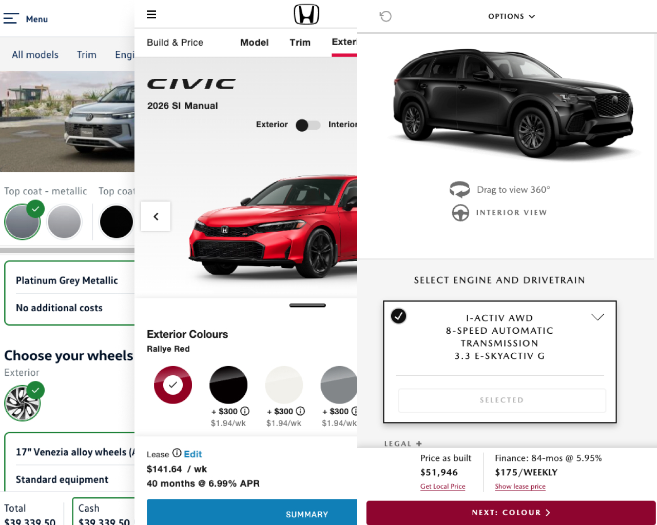 To improve navigation, we reviewed Build and Price flows from other high-consideration industries, especially automotive. Car manufacturers use clear step-based navigation, and applying that model helped early testers move through our flow with confidence.